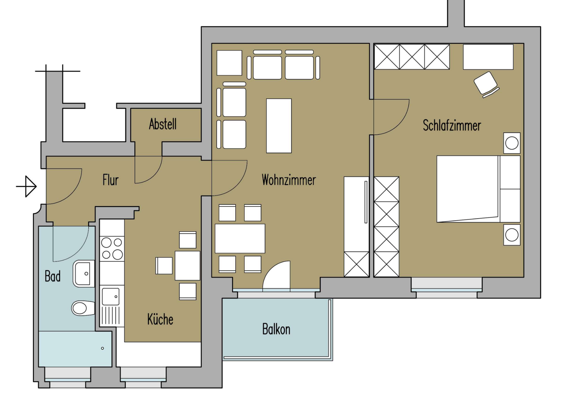 Wohnzimmer, Badezimmer, Flur, Abstellraum und einen Balkon. Die